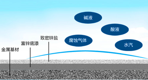 當(dāng)涂膜上有部位損傷后,露出基體金屬,在較小面積內(nèi)腐蝕電流能流向鋼鐵露出部分,則鋅的產(chǎn)物就沉積在此處形成一層保護(hù)膜,延緩腐蝕繼續(xù)發(fā)生。