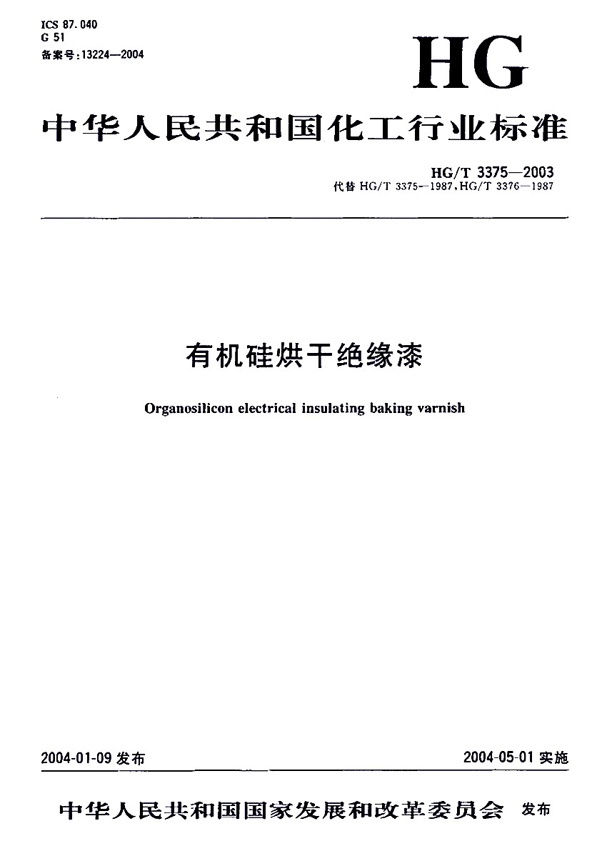 HG/T 3375-2003有機(jī)硅烘干絕緣漆標(biāo)準(zhǔn) ICS87.040 G51 備案號(hào):13224-2004 HG 中華人民共和國(guó)化工行業(yè)標(biāo)準(zhǔn) HG/T 3375-2003代替 HG/T 3375-1987,HG/T 3376-1987 有機(jī)硅烘干絕緣漆Organosilicon electrical insulating baking varnish 2004-01-09發(fā)布,2004-
